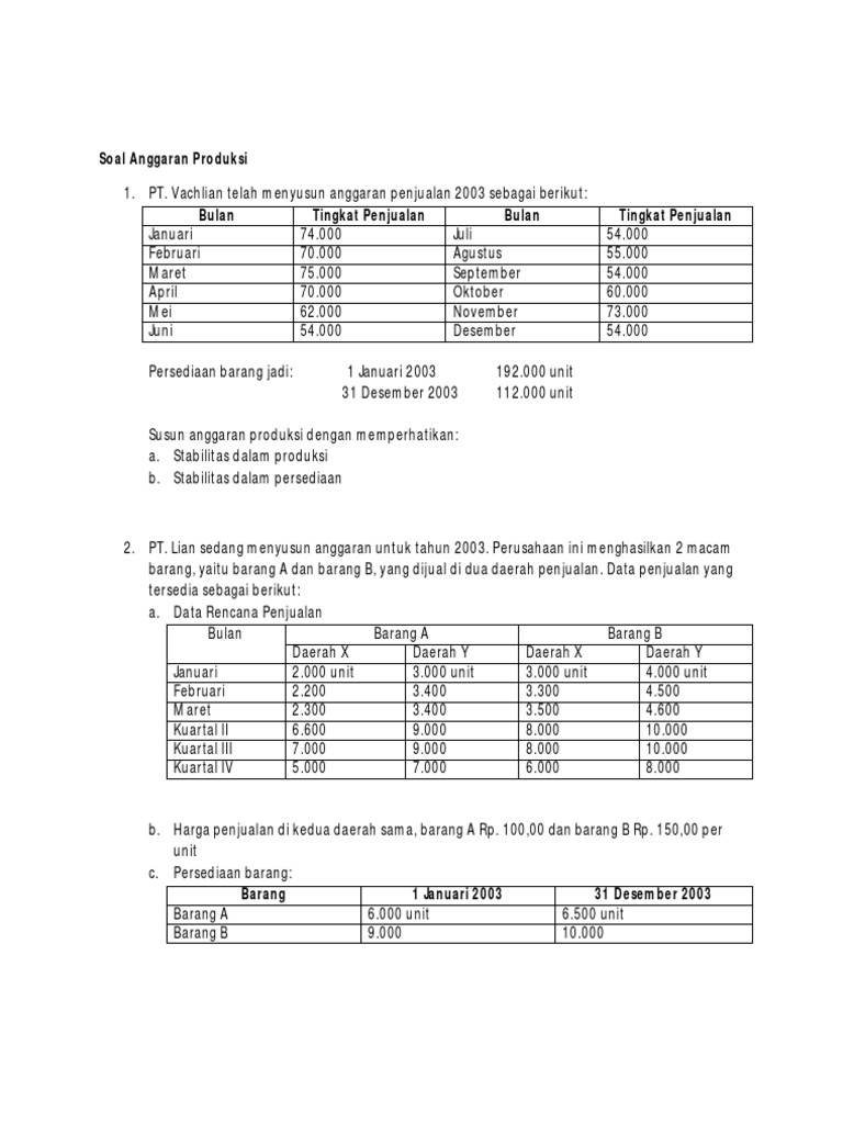 Anggaran produksi disusun dengan berdasarkan pada anggran penjualan yang telah disusun sebelumnya. Itulah berbagi kumpulan data terkait contoh soal dan jawaban anggaran produksi. Dengan cara ini tingkat produksi dan persediaan dibiarkan berubah ubah. Pada umumnya anggaran penjualan ini disusun untuk satu periode atau satu tahunnamun untuk keperluan perencanaan koordinasi dan pengawasan dalam perusahaan tersebut selayaknya anggaran penjualan yang disusun ini juga dilengkapi dengan rincian penjualan bulananbahkan beberapa perusahaan yang mendasarkan penyusunan anggaran penjualan dari pada pengecer agen dan distributor tidak jarang. Tingkat produksi tidak boleh berfluktuasi lebih dari 15 di atas atau di bawah rata rata bulanan. Fungsi anggaran produksi adalah sebagai alat perencanaan pengkoordinasian dan pengawasan.