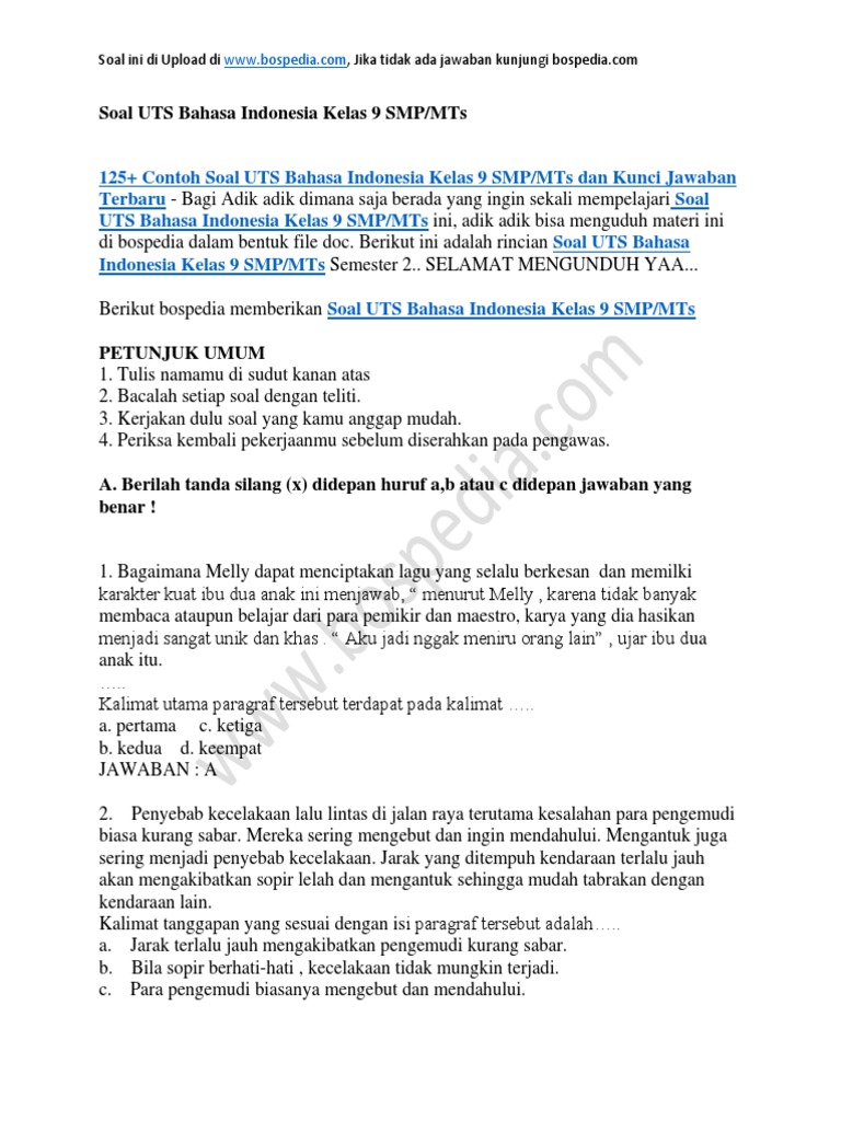 Lengkap 55 Contoh Soal Uts Bahasa Indonesia Kelas 9 Smp