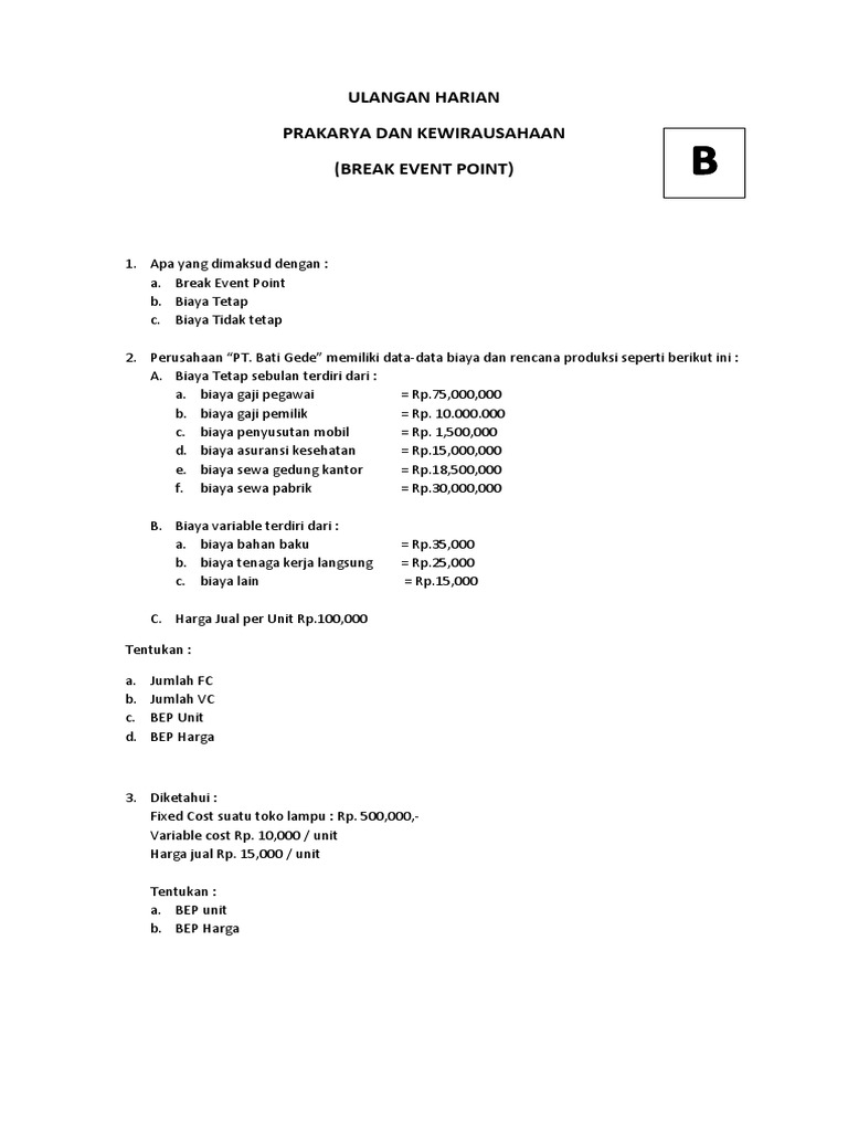 Tulis nama anda di sudut kanan atas. Pengertian rumus dan cara menghitung break even point dalam sebuah usaha atau bisnis dipakai suatu ukuran umum dalam menentukan dan menilai keberhasilan manajemen usaha dalam mencapai target penjualan sehingga terjadi keuntungan atau laba maksimal. Contoh soal kewirausahaan kwu kelas 12 semester 1 dan semester 2 kurikulum 2013 untuk kisi kisi latihan soal uas mid semester berupa soal pilihan ganda dan.