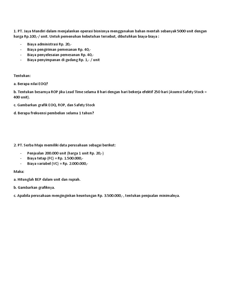 Contoh soal dan jawaban break even point. Pengertian break even point komponen dan contoh soal cara menghitung break even point lengkap dalam menilai keberhasilan suatu manajemen perusahaan diukur dengan pencapaian target penjualan hal tersebut berarti terjadinya laba yang maksimal dan untuk mencapai keuntungan maksimum tersebut dipengaruhi oleh tiga faktor pendukung diantaranya seperti biaya produksi harga jual dan banyaknya. Jika harga jual perunit adalah rp. Sebuah perusahaan melakukan investasi sebesar rp. Suatu perusahaan sepatu mengeluarkan biaya tetap dan biaya variabel berturut turut adalah rp. Pengertian break even point komponen dan contoh soal cara menghitung break even point lengkap dalam menilai keberhasilan suatu manajemen perusahaan diukur dengan pencapaian target penjualan hal tersebut berarti terjadinya laba yang maksimal dan untuk mencapai keuntungan maksimum tersebut dipengaruhi oleh tiga faktor pendukung diantaranya seperti biaya produksi harga jual dan banyaknya.