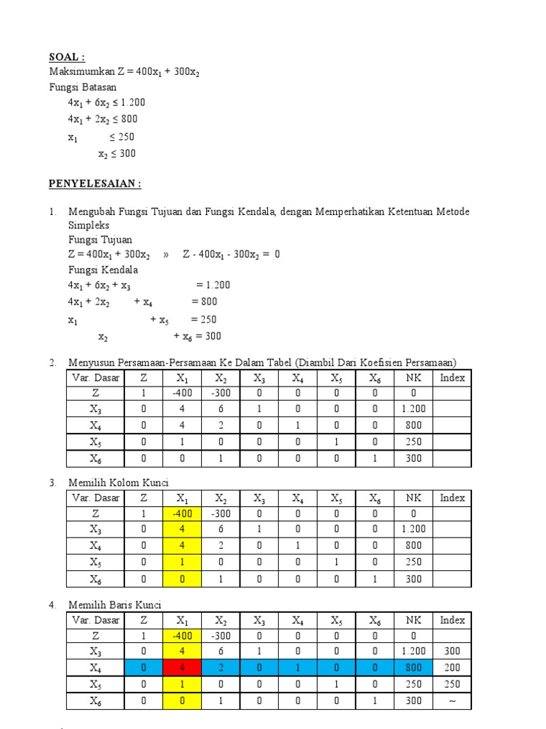 Tabel sudah minimum jika semua nilai dari zj cj 0. Pada masalah minimasi optimally condition berubah di mana entering variabel dipilih dari variabel yang memiliki koefisien positif terbesar pada persamaan z. Nk adalah nilai kanan persamaan yaitu nilai di belakang tanda sama dengan. Penyelesaian menggunakan metode simplex. Inilah pembahasan selengkapnya mengenai contoh soal cerita metode simpleks maksimum 3 variabel. Pada contoh di atas metode simpleks diterapkan pada masalah maksimasi.