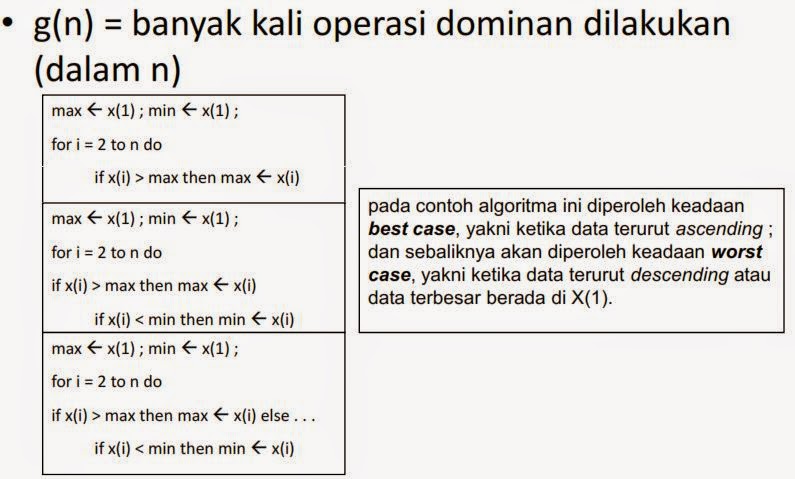 Contoh algoritma pengertian sejarah ciri fungsi jenis manfaat sifat struktur untuk pembahasan kali ini kami akan mengulas mengenai algoritma yang dimana dalam hal ini meliputi pengertian contoh sejarah ciri fungsi jenis manfaat sifat dan struktur untuk lebih memahami dan mengerti simak ulasan dibawah ini. Contoh menghitung kompleksitas waktu. Algoritma tsppada sebuah graf lengkap dengan 100 simpul maka n 100. Kompleksitas waktu asimptotik tinjau tn 2n2 6n 1 perbandingan pertumbuhan tn dengan n2 n tn 2n2 6n 1 n2 10 100 1000 10000 261 2061 2006001 2000060001 100 1000 1000000 1000000000 untuk n yang besar pertumbuhan tn sebanding dengan n2. Dalam praktek perhitungan kompleksitas ukuran masukan dinyatakan sebagai variabel nsaja.