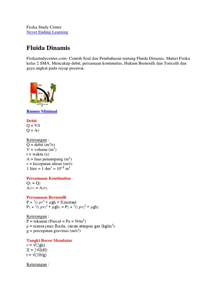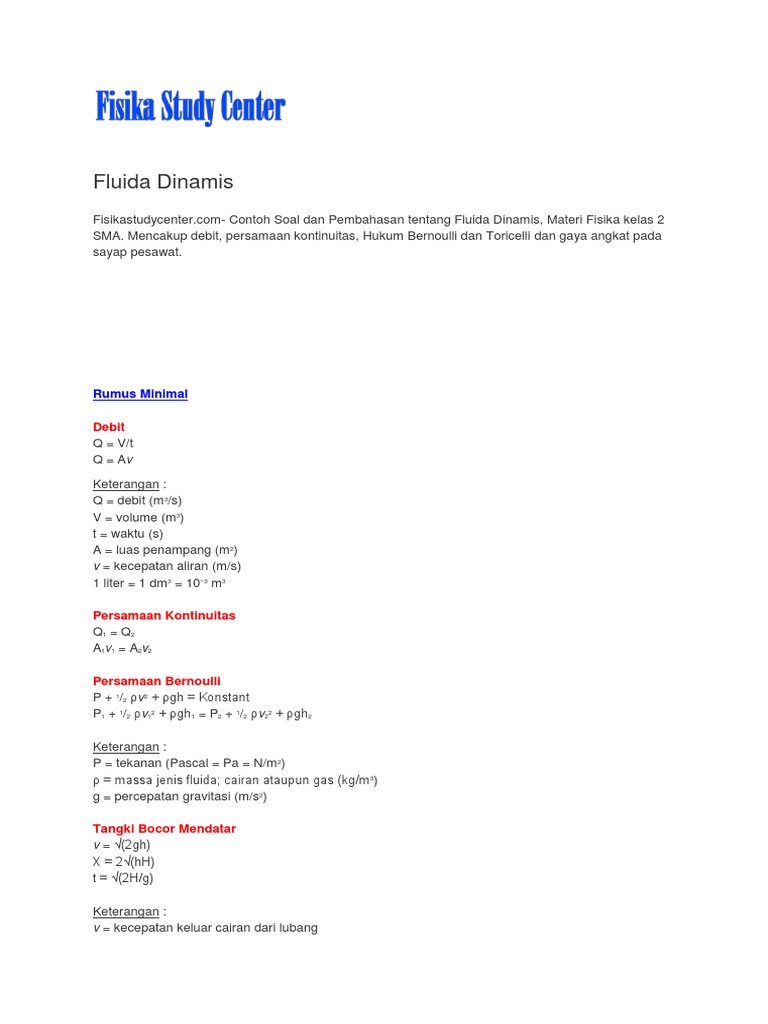 Contoh soal dan pembahasan. Contoh soal dan pembahasan tentang fluida dinamis materi fisika kelas 2 sma. Contoh soal fluida dinamis fluida dinamis adalah fluida bisa berupa zat cair gas yang bergerak. November 20 2017 admin leave a comment. Soal dan pembahasan fluida dinamis. Mencakup debit persamaan kontinuitas hukum bernoulli dan toricelli dan gaya angkat pada sayap pesawat.