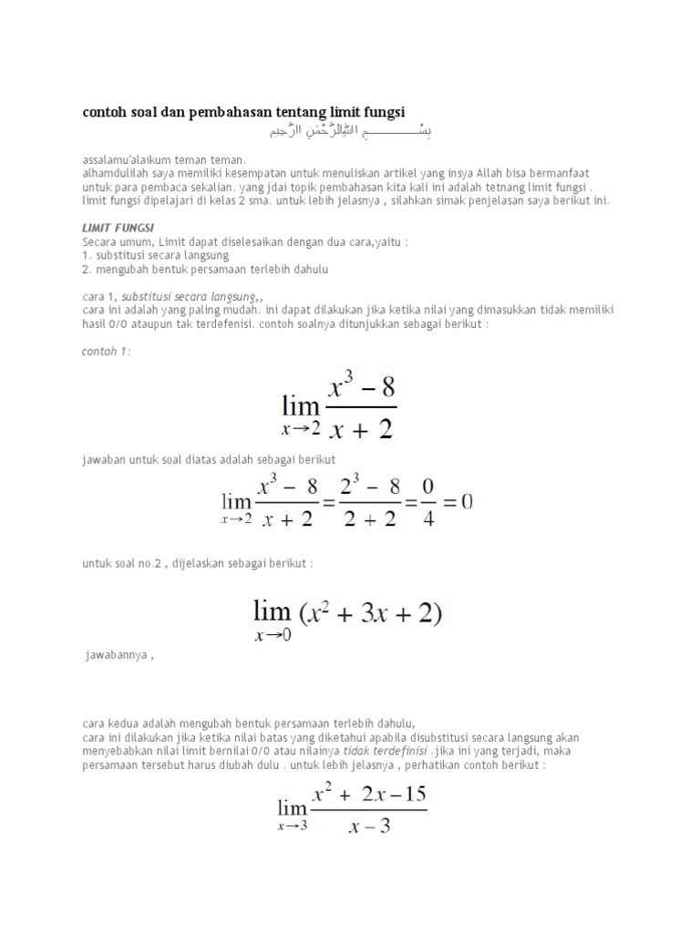 Pengertian limit dalam ilmu matematika. Lim x termasuk juga limit x 0 mulai dari yang mudah dulu tipe soal soal limit yang bisa diselesaikan dengan substitusi langsung seperti contoh berikut. Limit didalam konsep ilmu matematik biasa digunakan untuk menjelaskan suatu sifat dari suatu fungsi saat agumen telah mendekati pada suatu titik tak terhingga atau sifat dari suatu barisan saat indeks mendekati tak hingga. Contoh 3 soal limit fungsi trigonometri. 4 soal limit fungsi aljabar un 2012 pembahasan ubah bentuk akarnya ke bentuk pangkat agar lebih mudah diturunkan seperti ini. Penyajian rumussimbol matematika di sini menggunakan latex sehingga lebih smooth dari segi tampilan.
