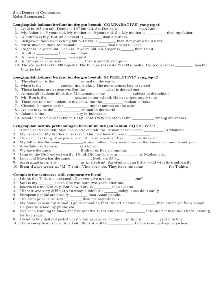 Inilah pembahasan lengkap terkait contoh soal comparative degree pilihan ganda beserta jawabannya. 20 contoh soal comparative degree adjective dan jawabannya beberapa orang yang telah mempelajari bahasa inggris pasti tidak asing lagi dengan degree of comparisondegree of comparison adalah salah satu contoh dari bermacam macam bentuk dalam bahasa inggris untuk membandingkan orang satu dengan yang lainnya atau benda satu dengan benda yang lainnya. Contoh soal degree of comparison pilihan ganda beserta. Pada kesempatan kali ini kita akan membahas tentang comparative degree adverb yaitu tingkatan kedua dari degree of camparison. 20 soal comparative degree adverb dan jawabannya degree of comparison atau derajat tingkatan untuk membandingkan suatu benda atau seseorang terbagi menjadi tiga tingkatan degree yaitu positive comparative dan superlative. Supaya pemahamanmu tentang materi degrees of comparison lebih baik lagi kamu dapat mencoba beberapa latihan soal berikut untuk mengasah kemampuanmu.