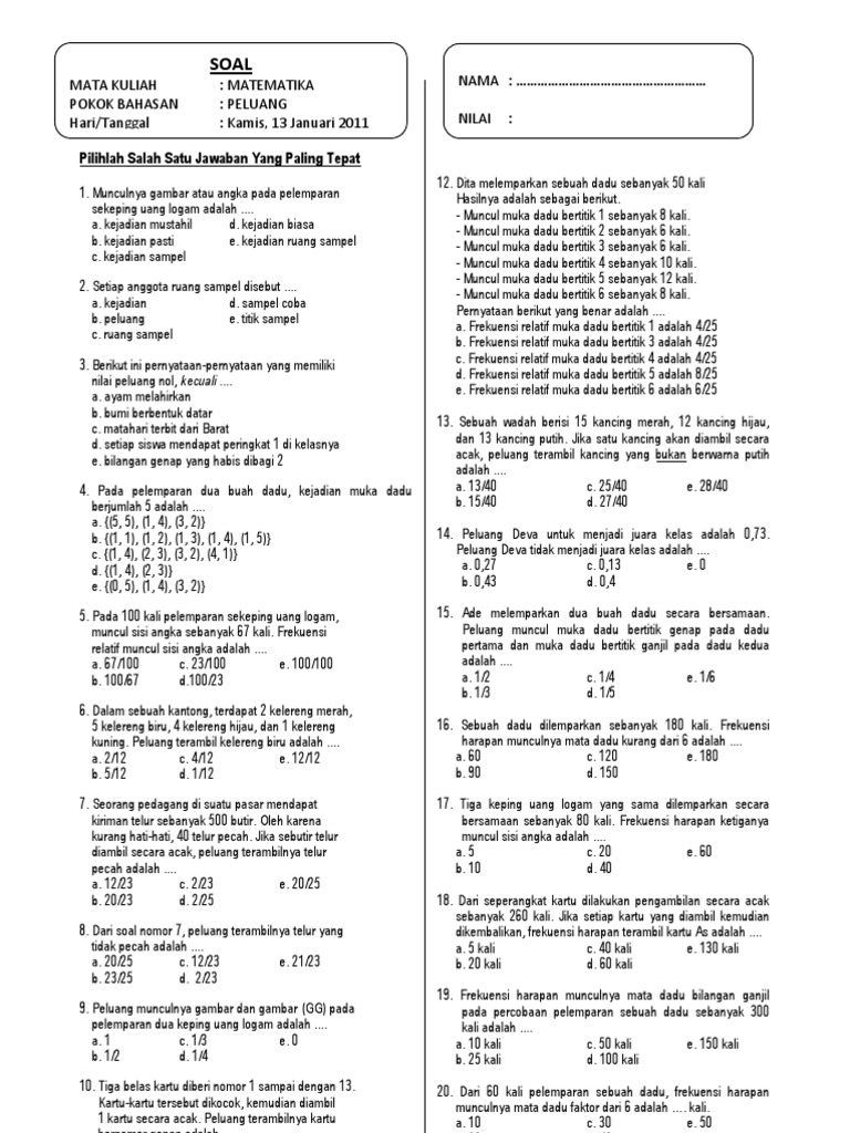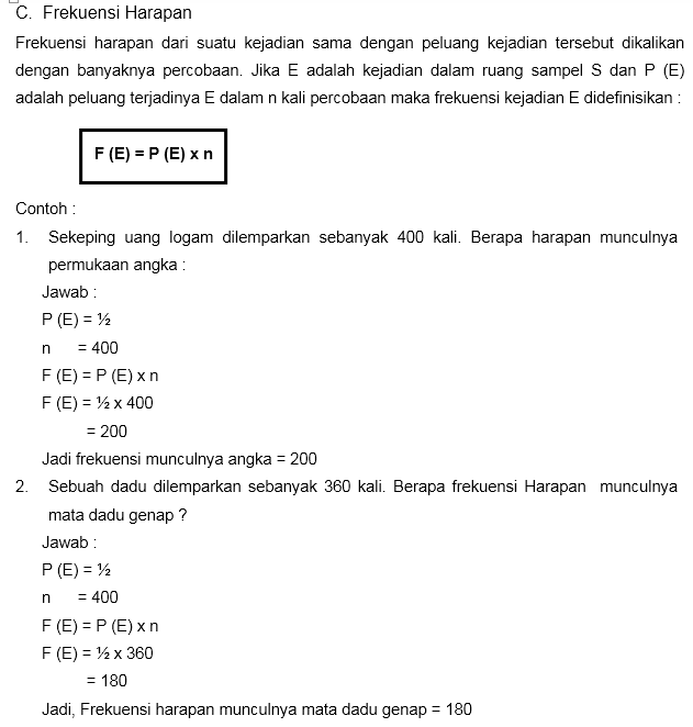 Contoh soal frekuensi harapan. Contoh soal peluang dan ekspektasi ini disusun dalam bentuk pilihan berganda dilengkapi dengan pembahasan dan dirancang sedemikian berdasarkan beberapa subtopik yang paling sering keluar dalam kajian peluang dan frekuensi harapan. Contoh soal frekuensi harapan dan jawabannya berikut ini adalah kisi kisi soal pretest ppg 2018 yang merupakan kumpulan file dari berbagi sumber kisi kisippg tentang contoh soal frekuensi harapan dan jawabannya yang bisa bapakibu gunakan dan diunduh secara gratis dengan menekan tombol download biru dibawah ini. Tentukan frekuensi harapan munculnya sisi angka. Misalkan k adalah himpunan kejadian munculnya sisi angka sehingga pk ½. Contoh soal dan pembahasan materi kombinasi. Peluang itu sendiri adalah sebuah bilangan yang menyatakan terdapat kemungkinan terjadi sesuatu dari seluruh kejadian yang ada.