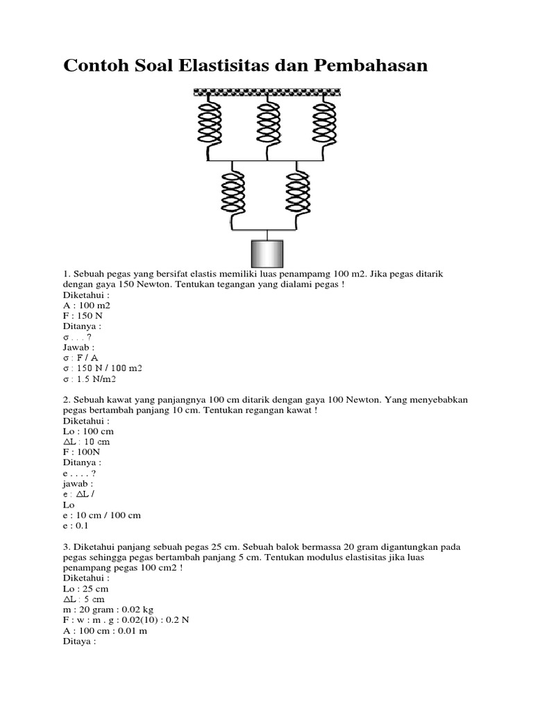Contoh soal gaya pegas. Pengertian gaya pegas rumus energi potensial rangkaian dan contoh soal gaya pegas lengkap pegas adalah suatu benda yang memiliki bentuk spiral yang terbuat dari bahan logam dan bersifat elastis sehingga dapat mempertahankan bentuknya dan akan kembali ke bentuk semula setelah diberi gaya. Bila pegas tersebut memiliki kontanta sebesar 400 nm 1. Contoh soal gaya pegas di sma kelas 2 nanti guru akan memberikan materi seputar gaya pegas. Contoh soal gaya pegas1. Jika pegas tersebut sobat dudukin hingga tertekan sejauh 10 cm.