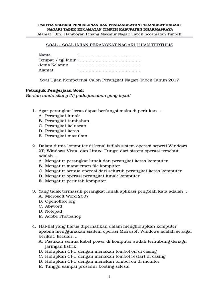 Contoh soal komputer perangkat desa. Berikut kisi kisi atau contoh soal ujian calon perangkat desa dan sekretaris desa beserta kunci jawabannya. Jika anda ingin mendownload soal dan jawaban di atas sudah kami sediakan link download. Contoh soal ujian perangkat desa dan kunci jawabannya telah kami sampaikan kepada anda. Contoh soal ujian perangkat desa. 12 komentar untuk 50 soal tes perangkat desa dan kunci jawaban pdf doc. Pada postingan sebelumnya hanya 20 soal tes perangkat desa kali ini saya update menjadi 90 soal tes.