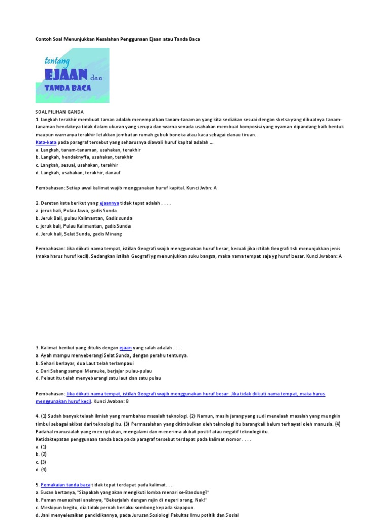 Latihan soal un contoh soal manyunting karangan memperbaiki kesalahan penggunaan ejaan soal soal tentang menyunting karangan pada ujian nasioanl tahun lalu 2016 muncul sampai 30 persen. Contoh ejaan yang di sempurnakan pengertian pemakaian huruf. Disajikan kalimat atau paragraf siswa dapat menentukan penggunaan ejaan yang tepat atau tidak tepat. By admin 02 februari 2016 contoh soal. Contoh soal dan pembahasan memperbaiki kesalahan penggunaan ejaan dan tanda baca tulisan yang benar sangat diperlukan untuk mendapatkan cara baca yang tepat serta tidak membingungkan. Melalui soal soal ini diharap anakdidik sanggup memahami penerapan dari beberapa jenis tanda baca dan ejaan yang benar dalam sebuah kalimat.