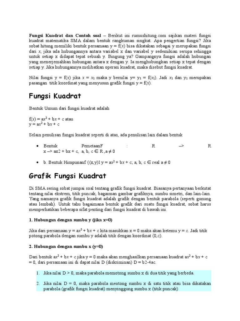 Misalkan a b c r dan a 0 maka persamaan yang terbentuk. Grafik fungsi kuadrat dalam bidang cartesius dikenal sebagai parabola. Untuk mengerjakan soal soal yang berkaitan dengan fungsi kuadrat kita harus memahami konsep dasar dalam fungsi kuadrat meliputi bentuk umum fungsi kuadrat itu sendiri nilai diskriminan fungsi kuadrat dan bagaimana pengaruh nilai tersebut terhadap bentuk dan sifat grafik fungsi kuadrat dan cara menggambar grafik fungsi kuadrat. Ax 2 bx c 0. Ingat titik potong dengan sumbu x akan didapatkan apabila nilai y0 maka dari itu akan didapatkan bentuk persamaan kuadrat x 2 6x80. Tidak menutup kemungkinan sejumlah siswa sulit memahami materi tersebut sehingga penulis.