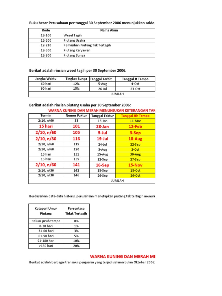Setelah mengetahui tentang penyisihan piutang tak tertagih sesuai ciri ciri akuntansi piutang akan mempermudah para pembaca untuk memahami tentang berbagai ketentuan tentang piutang tak tertagih yang terdiri dari estimasi piutang tak tertagih dan metode penghapusan piutang tak tertagih. Admin blog berbagi contoh soal 2019 juga mengumpulkan gambar gambar lainnya terkait contoh soal umur piutang dan jawabannya dibawah ini. Jika piutang usaha tersebut diperkirakan tidak dapat ditagih maka jumlah sebesar 6060 promes plus bunga akan menjadi bagian dari beban piutang tak tertagih. Piutang dagang harus dicatat dan dilaporkan dalam neraca sebesar nilai kas bersih neto yang bisa direalisasikan yaitu jumlah piutang setelah dikurangi cadangan kerugian piutang tak tertagih. Penyisihan dan penghapusan piutang tak tertagih adalah suatu kerugian yang timbul karena adanya piutang yang tak tertagih oleh perusahaan. Cara menyusun kartu piutang sesuai prosedur.