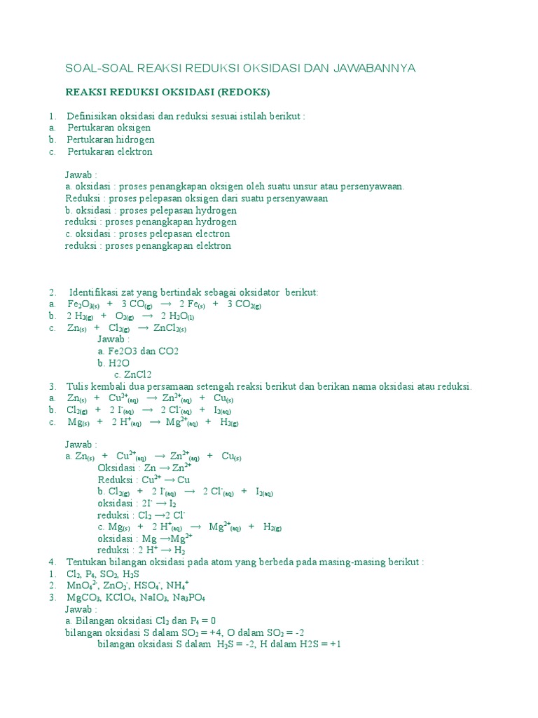 Contoh soal redoks dan jawabannya. Al jabar contoh soal aljabar kelas 7. Reaksi redoks adalah suatu reaksi yang didalamnya terjadi oksidasi dan reduksi. Tahap 1 kita tentukan reaksi ionnya. Soal soal reaksi reduksi oksidasi dan jawabannya. Yang memiliki bilangan oksidasi 1 atau 7 tidak dapat mengalami auto redoks karena bilangan oksidasi 1 tidak dapat direduksi lagi dan bilangan oksidasi 7 tidak dapat dioksidasi lagijadi pasangan ion atau molekul yang tidak dapat mengalami auto redoks adalah cl dan naclo 4. Artikel contoh soal logaritma dan jawabannya.