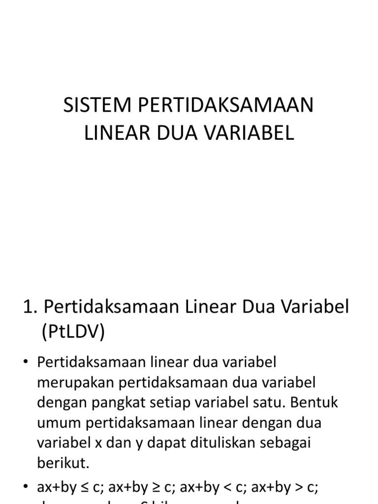 Pertidaksamaan linear dua variabel adalah kalimat terbuka matematika yang memuat dua variabel dengan masing masing variabel berderajat satu dan dihubungkan dengan tanda ketidaksamaan. Tanda ketidaksamaan yang dimaksud disini antara lain.
