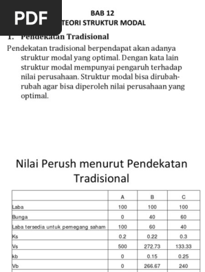 Struktur modal perusahaan menggambarkan perbandingan antara hutang jangka panjang dan modal sendiri yang digunakan oleh perusahaan. Contoh soal managemen keuangan cost of capital dan struktur modal 1 management vierzehn latihan teori mm tanpa pajak perusahaan a dan b sama persis kecuali bahwa kedua perusahaan a tidak menggunakan hutang dan perusahaan h mempunyai hutang 100jt dengan bunga 10 asumsikan bahwa semua asumsi mm terpenuhi tidak ada pajak ebit perusahaan. Struktur modal merupakan cermin dari kebijaksanaan perusahaan dalam menentukan jenis sekuritas yang dikeluarkan karena masalah struktur modal adalah erat hubungannya dengan masalah kapitalisasi dimana disusun dari jenis jenis funds yang membentuk kapitalisasi adalah struktur modalnya. Jika tingkat kapitalisasi modal sendiri tingkat kapitalisasi berarti tingkat keuntungan yang disyaratkan untuk modal sendiri sebesar 11 maka cara menghitung penilaian perusahaannya adalah sebagai berikut. Berikut ini adalah contoh. Jika tingkat keuntungan yang disyaratkan oleh pemilik modal sendiri adalah 20.