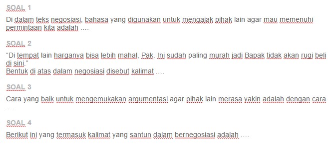 Contoh soal teks negosiasi. Contoh soal teks negosiasi 1. Selain itu ada juga pembahasan tentang pengertian fungsi dan tujuan ciri ciri kaidah kebahasaan dan macam macam jenis teks negosiasi. Melanjutkan tulisan soal bahasa indonesia kelas x semester 2 kurikulum 2013 pilihan ganda wajib bagian pertama soal nomor 1 10 bagian kedua dimulai dari soal nomor 11 25. Serta tawar menawar dab penyelesaian masalah. Interaksi sosial yang berfungsi untuk kesepakatan bersama. Contoh teks negosiasi berbagai kasus baik benar untuk pembahasan kali ini kami akan mengulas mengenai teks negosiasi yang dimana dalam hal ini meliputi contoh berbagai kasus baik benar nah agar lebih memahami dan dimengerti simak ulasannya dibawah ini.