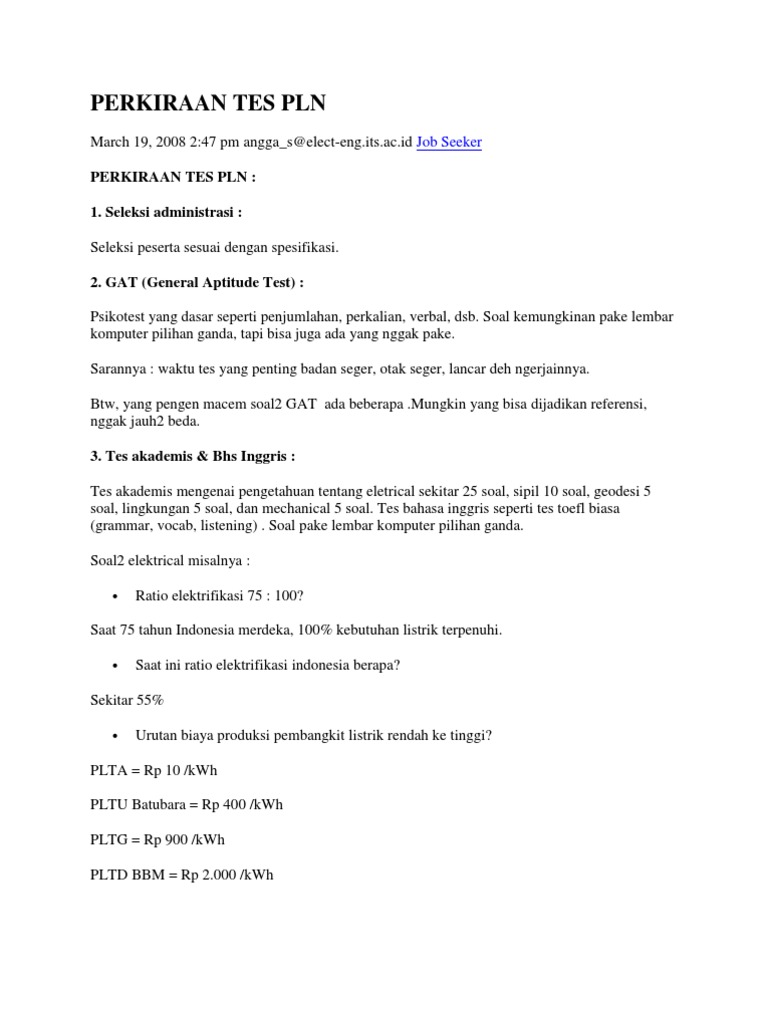 Contoh soal tes pln. Tes masuk pln sebenarnya tergolong standar. Contoh soal gat pln. Contoh soal tes akademik masuk pln tes akademik atau tpa adalah tes yang dapat digunakan untuk mengungkap apa yang telah dicapai seseorang peserta secara intelektual. Tes akademik dilakukan secara tertulis dan digunakan untuk mengungkap kualitas intelektual maka untuk mengetahui tinggirendah nilai tes akademik biasa diukur berdasarkan tingkat kecerdasan. Soal tes akademik stt pln gelombang ii 2013 binggris mtk fisika diunggah oleh. Contoh soal dan jawaban tes masuk pln bagi anda yang ingin masuk pln tentu akan diperhadapkan dengan rangkaian tes yang akan diujikan kepada anda dan agar bisa lulus anda harus menjawab soal tersebut.