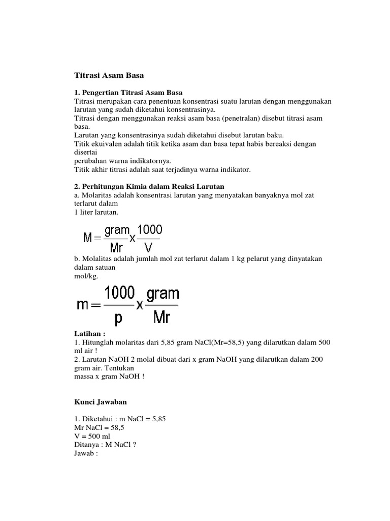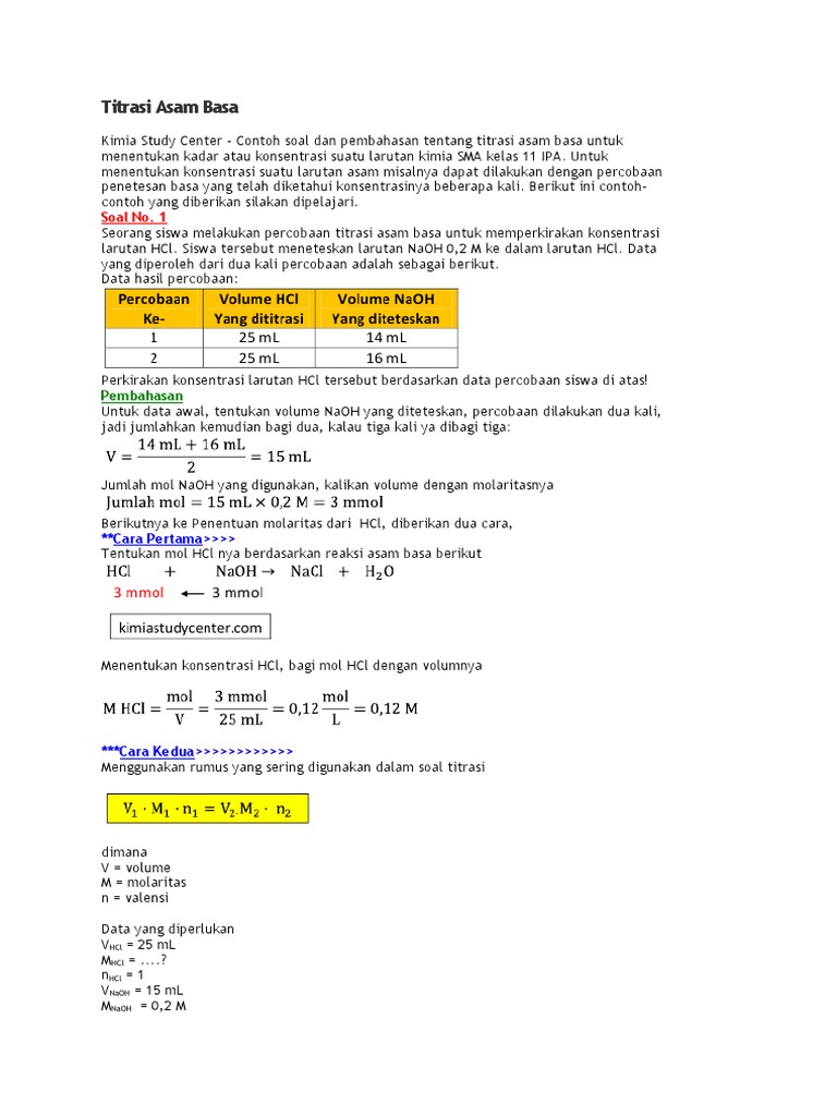 Selain itu kamu juga bisa mendownload contoh soal asam basa ini lohh. Inilah beberapa contoh soal dan jawaban tentang titrasi asam basa. Contoh soal dan pembahasan asam basa dan titrasi. Sebagai contoh 40 ml larutan hcl 01 m ditetesi dengan larutan naoh 01 m sedikit demi sedikit. Volume titran yang dibutuhkan untuk mencapai titik ekuivalen yaitu sebanyak 18 ml. Kalau perlu tulis kembali di atas kertas supaya mengurangi kebingungan.