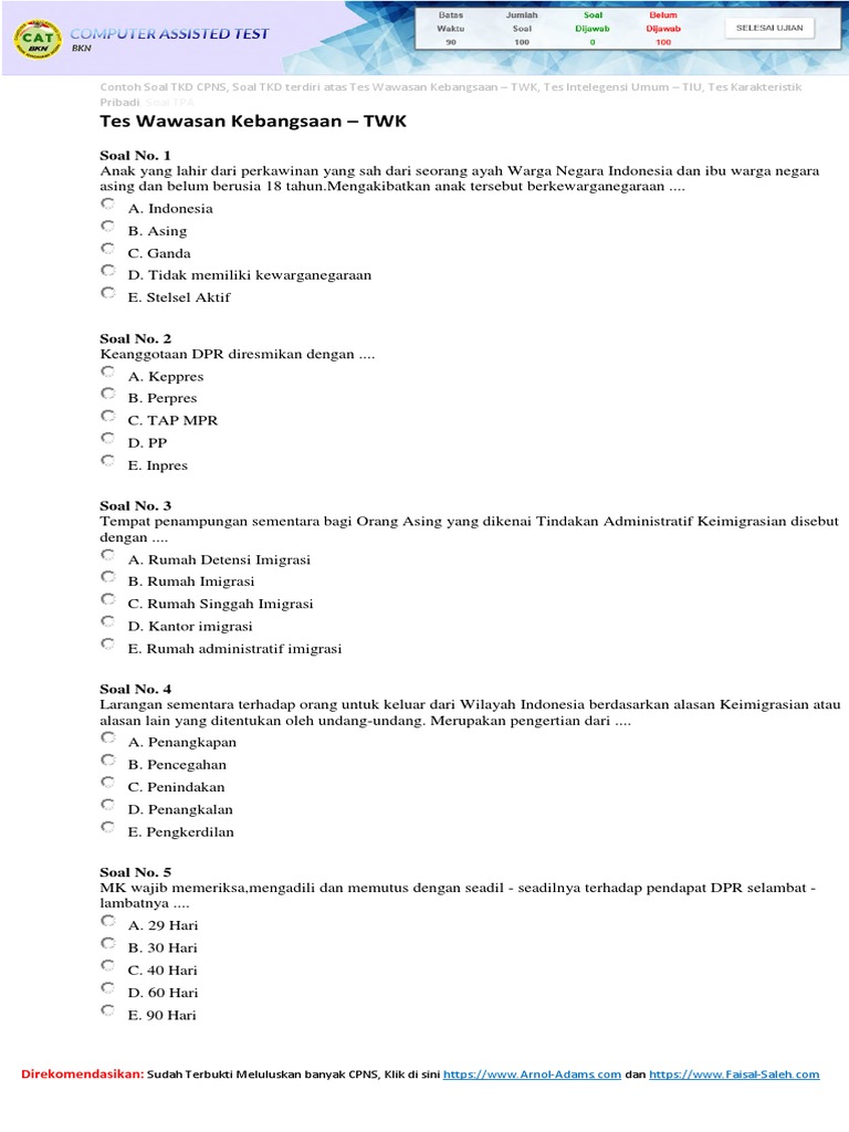 Contoh soal tkd cpns. Waktu yang diberikan untuk mengerjakan soal tkd biasanya selama 180 menit. Demikian info contoh soal seleksi kompetensi dasar skd atau soal tkd tes kemampuan dasar tahun 2018. Semoga contoh soal ini bisa bermanfaat sehingga bisa lulus tes kompetensi dasar dengan nilai yang tinggi. Tes wawasan kebangsaan twk soal cat cpns tes wawasan kebangsaan merupakan bagian dari tes kompetensi dasar yang akan diujikan bagi para peserta seleksi cpns untuk menilai peserta cpns dalam penguasaan pengetahuan dan kemampuan dalam mengimplementasikan nilai nilai 4 empat pilar kebangsaan indonesia yang meliputi. Soal tes tkd seleksi cpns 2014 dibuat oleh konsorsium perguruan tinggi negeri. Sebelum mengikuti tes kompetensi dasar tkd cpns ada baiknya teman teman mempersiapkan diri sedini mungkin.