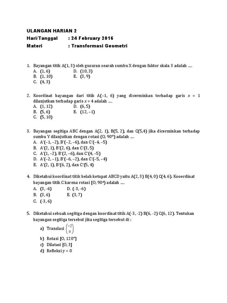 Transformasi geometri makalah dilatasi contoh kumpulan soal dosenpendidikancom transformasi merupakan suatu pemetaan titik pada suatu bidang kehimpunan titik pada bidang yang sama dan jenis jenis dari transformasi. Contoh soal transformasi geometri dan pembahasan contoh soal 1. Guru sd smp sma contoh soal transformasi geometri kelas 11 smk. Transformasi geometri adalah salah satu materi matematika bidang geometri yang mempelajari perubahan posisi dan ukuran benda dengan menggunakan konsep matematis. Oleh dosenpendidikan diposting pada 29122019. Transformasi geometri makalah dilatasi contoh kumpulan soal dosenpendidikancom transformasi merupakan suatu pemetaan titik pada suatu bidang kehimpunan titik pada bidang yang sama dan jenis jenis dari transformasi.