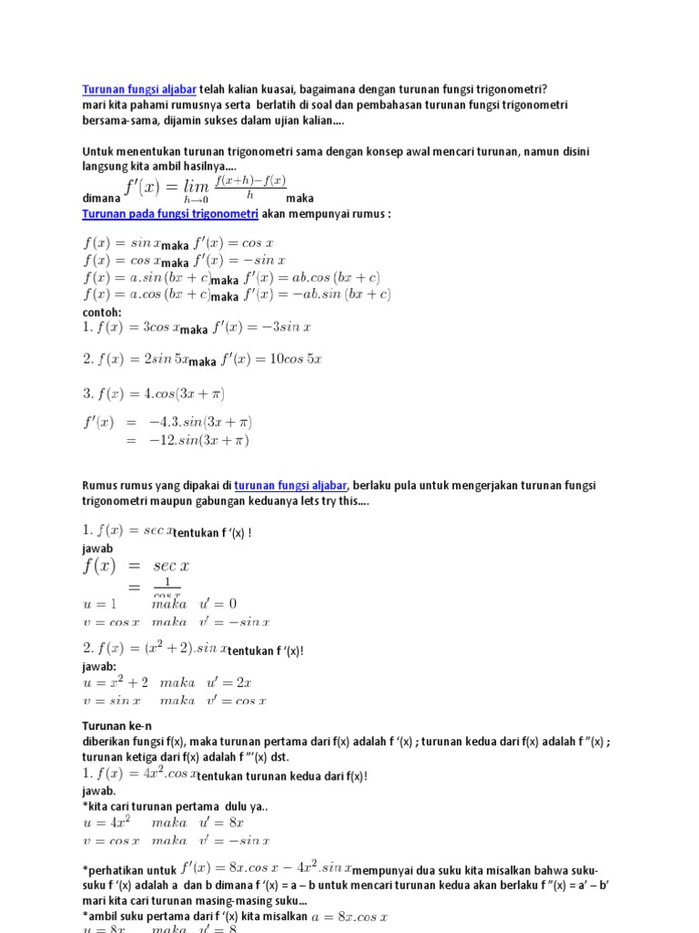 Lebih lanjut aturan turunan tersebut selanjutnya diterapkan untuk menyelesaikan persoalan fungsi trigonometri. Turunan fungsi aljabar merupakan fungsi lain dari suatu fungsi sebelumnya sebagai contoh fungsi f menjadi f yang memiliki nilai tidak beraturan.