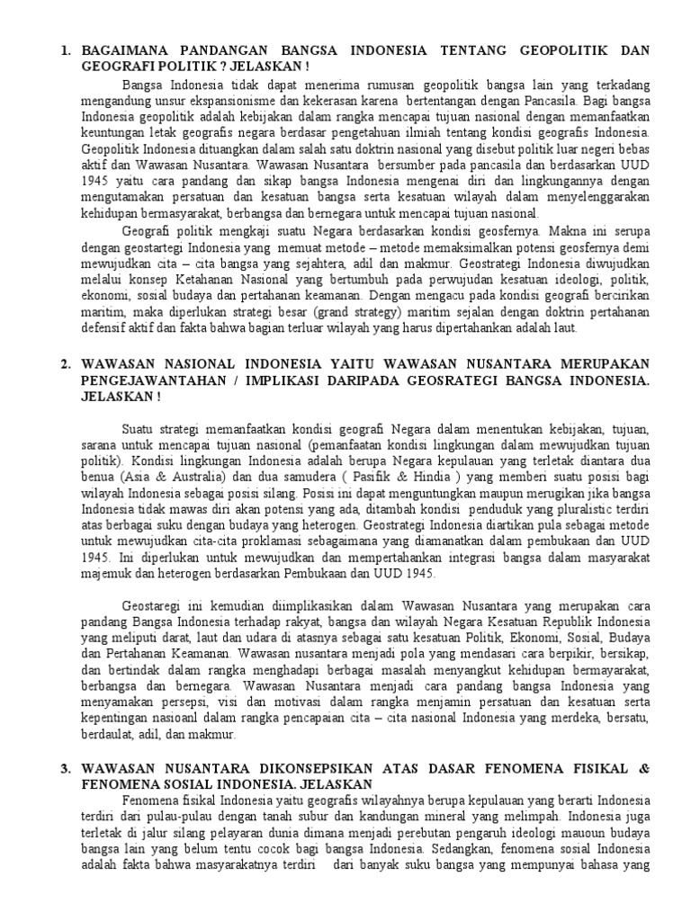 Mengapa geopolitik dikatakan sebagai ilmu bumi politik jelaskan alasannya. Apakah pengertian wawasan nusantara yang anda ketahui. Berikut ini adalah beberapa soal yangmenyangkut wawasan nusantara. Wawasan nusantara bab i pendahuluan latar belakang salah satu persyaratan mutlak harus dimiliki oleh sebuah negara adalah wilayah kedaulatan di samping rakyat dan pemerintahan yang diakui. Implementasi ini juga akan menciptakan kehidupan masyarakat dan bangsa yang rukun dan bersatu tanpa membedakan suku asal usul daerah agama atau kepercayaanserta golongan berdasarkan status sosialnya. Contoh soal tes wawasan kebangsaan twk ini saya kumpulkan dari beberapa aplikasi simulasi cat cpns yang dilengkapi dengan jawabannya.