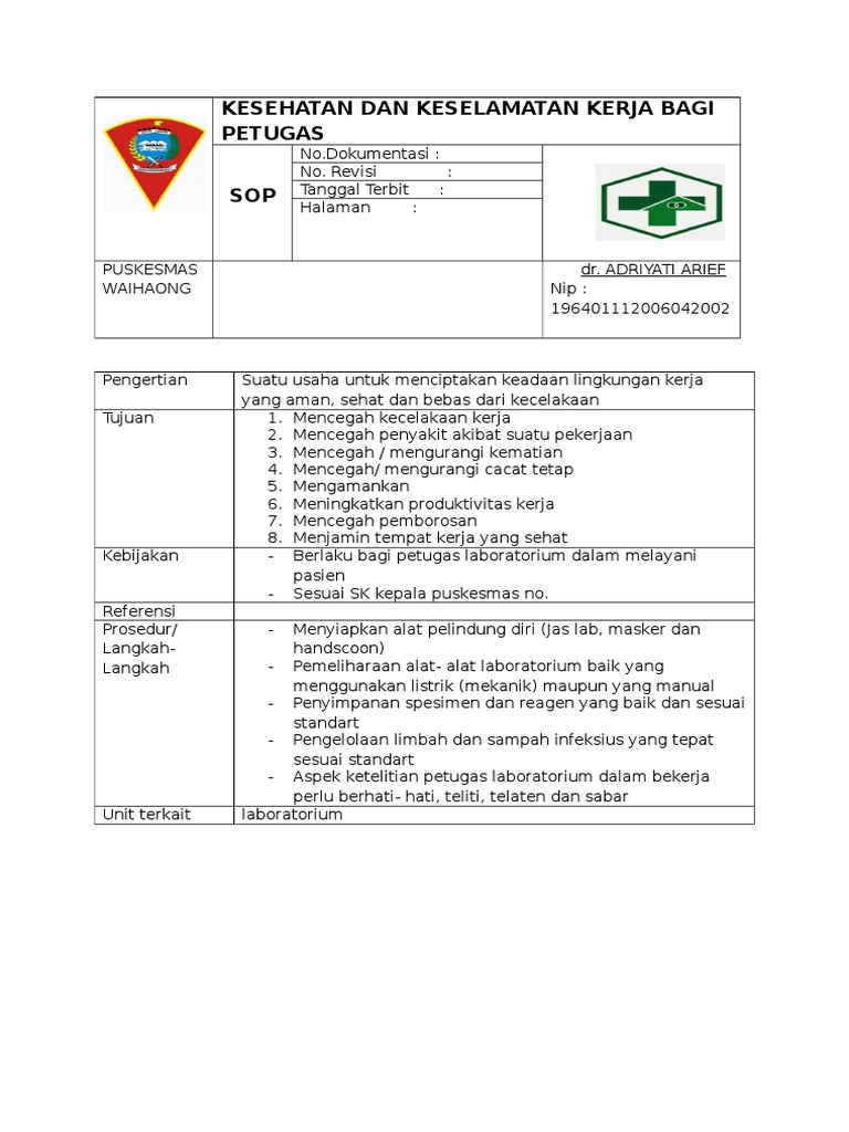 Contoh sop k3 di tempat kerja. Kerja bab xii kesehatan kerja pasal 164 166. Rambu keselamatan dan kesehatan kerja peringatan sangat penting dalam hal komunikasi k3 agar pekerja selalu tahu risiko di tempat kerja dan bisa memperkirakan apa yang harus dilakukan. Meningkatkan dan memelihara kesehatan dan keselamatan setiap tenaga kerja dalam unit manajemen baik secara jasmani maupun rohani. Contoh sop perusahaan sop atau standar operasional prosedur adalah dokumen petunjuk pelaksanaan suatu kegiatan atau pekerjaan agar mencapai hasil yang optimalsop dibuat untuk menertibkan dan menstandarisasi suatu kegiatan atau proses pekerjaan. Tempat kerja dimaksud berdimensi sangat luas mencakup segala tempat kerja baik di darat di dalam tanah di permukaan tanah dalam air di udara maupun di ruang angkasa. Poster k3 atau keselamatan dan kesehatan kerja sangat penting untuk menyampaikan pesan k3 kepada pekerja.