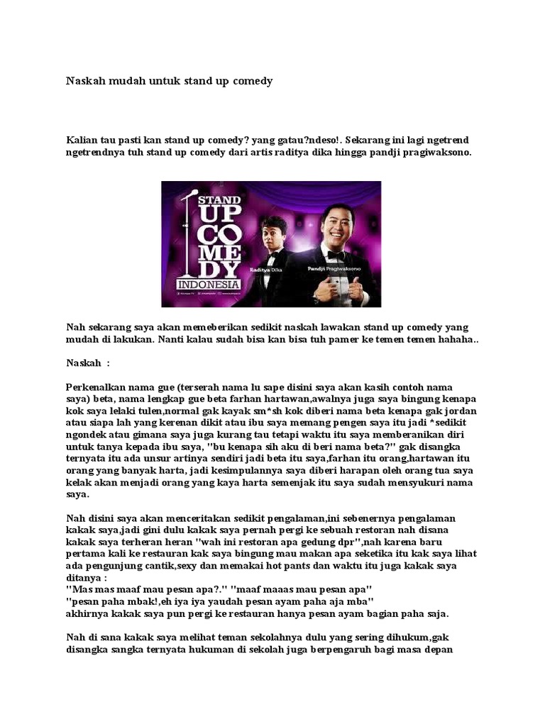 Contoh stand up comedy. Comic membawakan lawakannya di atas panggung seorang diri biasanya di depan pemirsa langsung dengan cara. Saya sering diejek hifdzi karena jarang mandi suci 4 duration. Materi stand up comedy teman dlawakan lucu indonesia kali ini saya akan berbagi contoh materi mengenai stand up comedy tetapi sebelum memulai materi stand up comedy lebih baiknya kita tahu dulu apa sih yang dinamakan stand up comedi itu mari kita simak ulasan berikut ini. Ners shinta 1940859 views. Stand up comedi adalah salah satu genre profesi melawak yang pelawaknya kadang disebut komika bahasa inggris. Stand up comedy merupakan istilah bahasa inggris yang dalam bahasa indonesia artinya lawakan tunggal atau komedi tunggal.