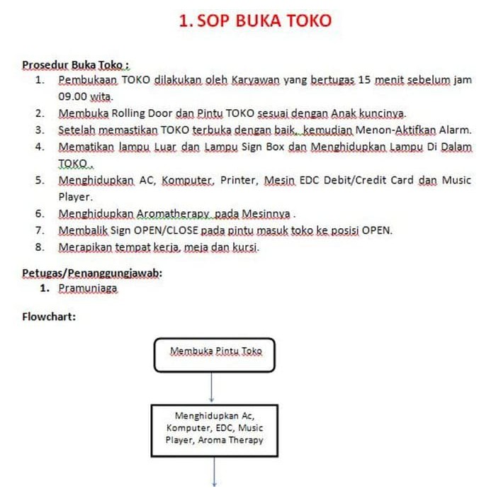 Contoh standar operasional prosedur toko. Contoh standar operasional prosedur sop pegawai masuk dari hari senin hingga jumat. Contoh tampilan bonus paket sop minimarket 1. Penggunaan sop sangat penting sekali untuk anda yang ingin menjalankan sebuah usaha. Standar operasional prosedur adalah penetapan tertulis mengenai apa yang harus dikerjakan kapan dimanaoleh siapa dan dibuat untuk emnghindari terjadinya variasi dalam proses pelaksanaan kegiatan yang dilakukan oleh pegawai yang akan mengganggu kinerja. Standar operasional prosedur sop minimarket. Format sop video adalah format standar operasional prosedur yang cocok digunakan untuk pengoperasian teknis visual dan sesuai untuk ragam bahasa.