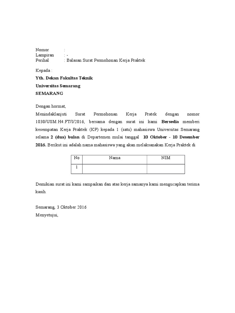 Jump to page. Dekan fakultas teknik universitas semarang semarang dengan hormat. Contoh surat balasan pkl dari perusahaan. Contoh surat balasan kkl. Contoh surat balasan pkl ini kami buat untuk anda semua supaya anda bisa langsung menggunakan untuk bisa memberikan kepada tempat sekolah mereka sehingga perusahaan bisa menuliskan surat balasan pkl ini untuk bisa langsung memberikan pekerjaan kepada siswa yang sudah melakukan pkl di perusahaan tersebut. Contoh surat resmi tentang pengiriman mahasiswa magang.