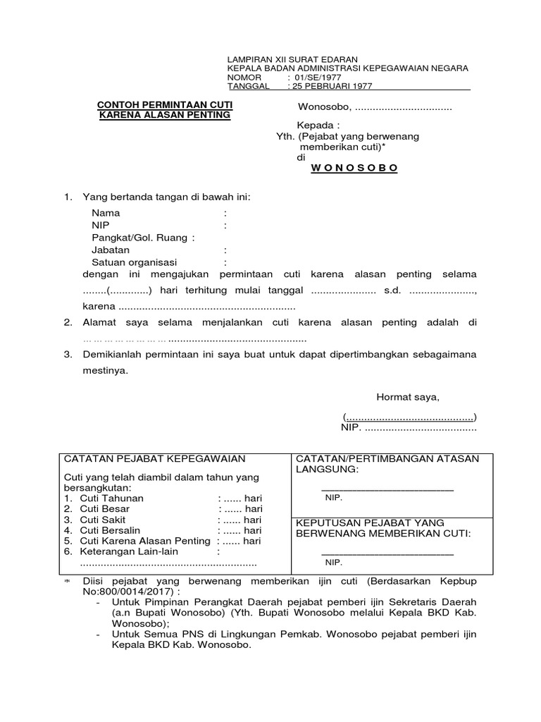 Contoh surat permohonan cuti kerja tahunan pns have a graphic from the othercontoh surat permohonan cuti kerja tahunan pns it also will feature a picture of a kind that might be seen in the gallery of contoh surat permohonan cuti kerja tahunan pns. 18 contoh surat izin cuti libur tidak masuk kerja bagi karyawan pns dan pegawai swasta surat izin oktober 19 2019 2023 contoh surat izin tidak masuk kerja bagi anda yang berstatus sebagai seorang karyawan pada sebuah perusahaan atau instansi tertentu ada kalanya akan membutuhkan beberapa hari untuk mengambil cuti atau libur. 15 contoh surat permohonan cuti paling lengkap jika anda seorang karyawan perusahaan pegawai negeri sipil atau bahkan mahasiswa tentunya tidak asing lagi dengan surat cuti. Yang dapat anda pelajari atau dapat anda jadikan referensi anda membuat surat permohonan cuti tahunan anda.