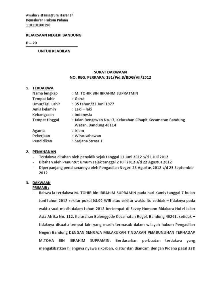 Contoh surat dakwaan pencurian. Contoh surat dakwaan contoh surat dakwaan pidana contoh surat dakwaan pidana di makassar contoh surat dakwaan tunggal contoh surat lamaran kerja contoh surat lamaran contoh surat contoh surat resign contoh surat undangan contoh surat kuasa contoh surat resmi contoh surat rasmi contoh surat perjanjian contoh surat permohonan contoh surat keterangan contoh surat penawaran. November 12 2015 surat. A nanda tulus riyadi tempat lahir. Dalam bentuk surat dakwaan ini antara lapisan satu dengan yang lainnya menggunakan kata sambung atau. Dalam dakwaan alternatif meskipun dakwaan terdiri dari beberapa lapisan hanya satu dakwaan saja yang dibuktikan tanpa harus memperhatikan urutannya dan jika salah satu telah terbukti maka dakwaan pada lapisan lainnya tidak perlu dibuktikan lagi. Dakwaan tunggal kasus pembunuhan kasus penganiayaan kasus penipuan surat dakwaan.