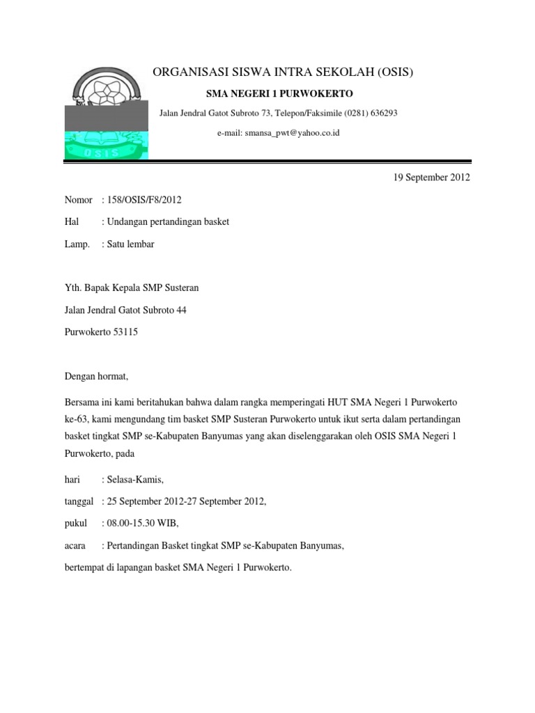 Semoga dapat membantu teman teman dan semoga dapat menjadi salah satu referensi buat teman teman dalam membuat surat dinar dari osis. Contoh surat izin kegiatan osis di sekolah terlengkap surat permohonan izin merupakan surat yang ditujukan kepada pihak tertentu yang berisikan permohonan izin untuk meminjam menggunakan menyewa sebuah tempat atau bangunan tertentu yang akan digunakan sebagai tempat untuk berlangsungnya sebuah acara. Dan seperti pada surat resmi pada umumnya surat resmi osis juga didalamnya harus memakai bahasa resmi yang baik baku dan bahasa yang sesuai eyd bahasanya singkat jelas dan padat serta terdapat nomor surat kop surat lembaga organisasi yang membuatnya tanda tangan serta cap basah.