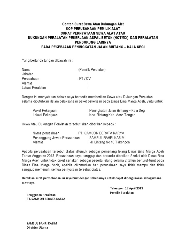 Attribution non commercial by nc format tersedia. Alam baru jaya surat dukungan alat alat berat untuk pekerjaan pematangan dan pemagaran lahan perkantoran dan laboratorium pppkebtke pokja ulp balitbang esdm jakarta jlnciledug raya kav109 cipulir kabayoran lama jakarta selatandengan dukungan alat berupa. Pt cv. Inilah yang dapat kami bagi terkait contoh surat permohonan sewa alat berat. Demikian contoh surat dukungan tender ini kami buat semoga bisa menjadi referensi yang baik bagi anda yang membutuhkan. Contoh surat sewa atau dukungan alat kop perusahaan pemilik alat surat pernyataan sewa alat atau.