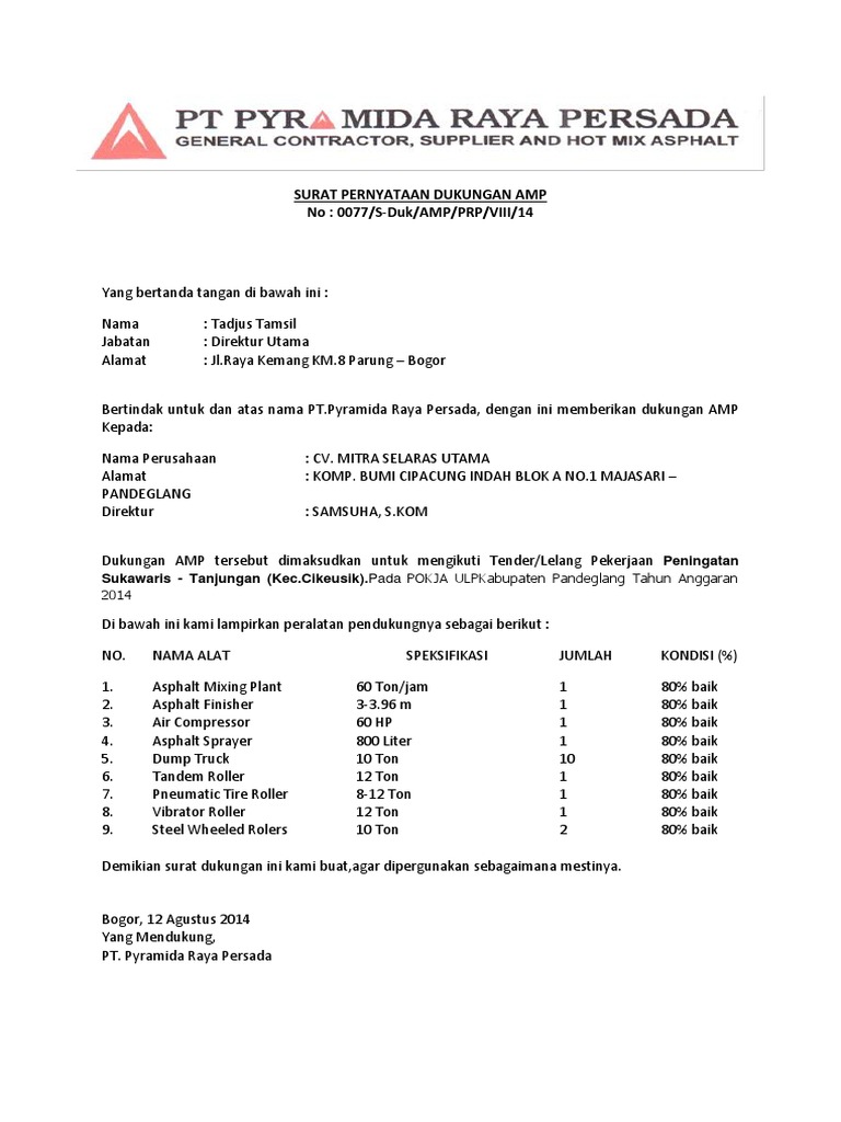 All the images that appear are the pictures we collect from various media on the internet. 4 4 mendukung 1 1 menolak. Ini karena besarnya nominal nilai proyek yang tentu saja akan membutuhkan biaya pelaksanaan yang tidak bisa dibilang sedikit juga. Jika anda memerlukan surat dukungan tender dari kami selaku distributor baja untuk tender proyek yang anda ikuti silahkan hubungi rekan kami yang nomor kontaknya telah kami sediakan di atas. Mohon maaf apabila terdapat kesamaan nama tempat ataupun informasi di dalamnya karena semua surat hanya bersifat percontohan saja tanpa ada maksud apapun. Nama jabatan perusahaan alamat lokasi peralatan.