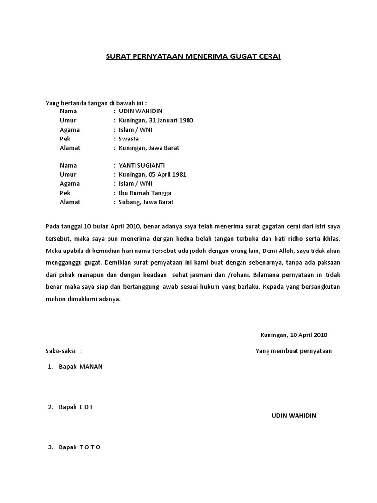 Ada banyak alasan yang mengharuskan sepasang suami istri untuk bercerai dan berpisah tergantung dari permasalahan keluarga masing masing. Namun apabila terjadi masalah rumah tangga yang tidak memungkinkan lagi bertahan biasanya istri atau suami akan menggugat cerai. Contoh blangko cerai gugat. Nama surat seperti pada surat pernyataan lain pada umumnya hal pertama yang harus dicantumkan adalah nama surat itu sendiri. Contoh surat pernyataan cerai pada umumnya tidak ada orang yang menginginkan perceraian namun pada kenyatannya masih sering terjadi kasus perceraian dimana mana. Contoh surat gugatan cerai.