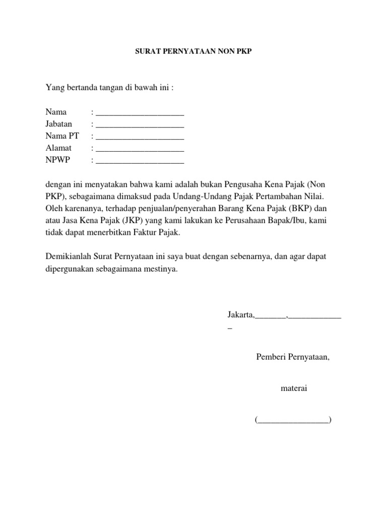 Pada umumnya surat pernyataan non pkp berisikan hal hal sebagai berikut. Tidak ada format baku untuk surat pernyataan non pkp. Mencantumkan nama pihak yang mengajukan keterangan bahwa dirinya bukan pengusaha kena pajak. Pernyataan yang bertandatangan di bawah ini diikuti beberapa keterangan. Dengan ini menyatakan bahwa kami adalah bukan pengusaha kena pajak non pkp sebagaimana dimaksud pada undang undang pajak pertambahan nilai. Berisi nama pihak yang.