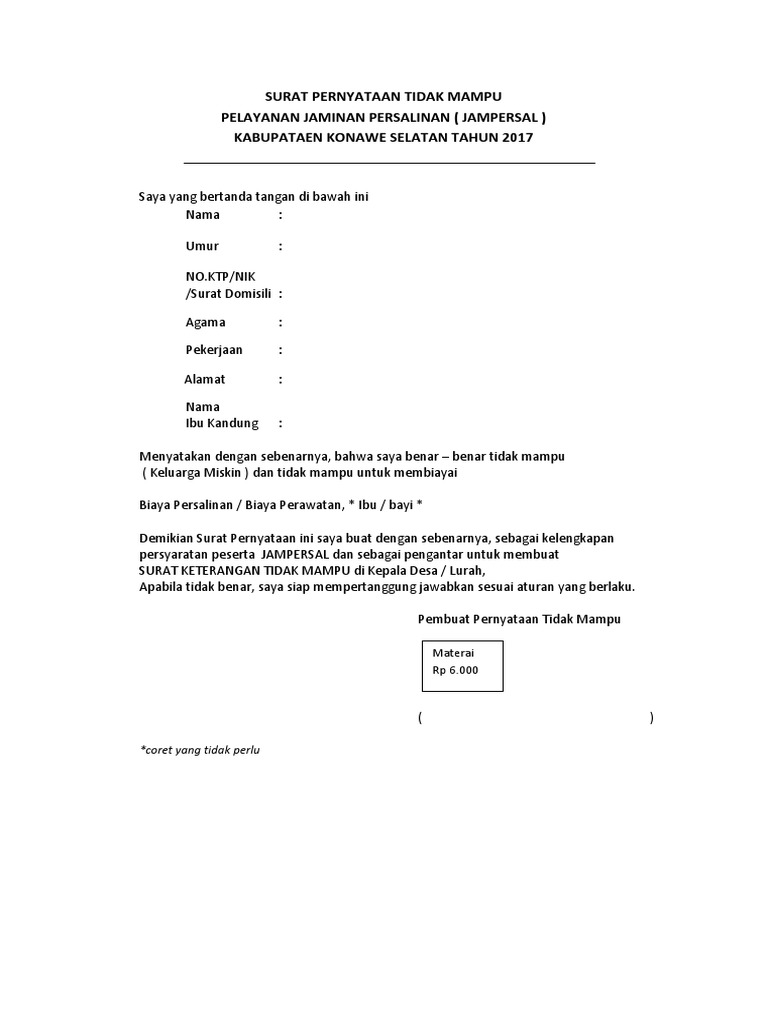Dengan menggunakan surat keterangan tidak mampu ini maka seseorang telah memiliki bukti resmi dari pihak berwenang bahwa orang yang bersangkutan memang benar sedang dalam keadaan kurang mampu dan membutuhkan bantuan. Surat keterangan tidak mampu adalah sebuah surat yang mana dibuat dan dikeluarkan oleh pihak yang berwenang ketua rt ketua rw kepala dusun kepada desa dan lainnya untuk dapat menerangkan bahwa seseorang yang telah disebutkan dalam surat tersebut merupakan salah atu warga yang tidak mampu yang berdomisili di daerah tertentu.