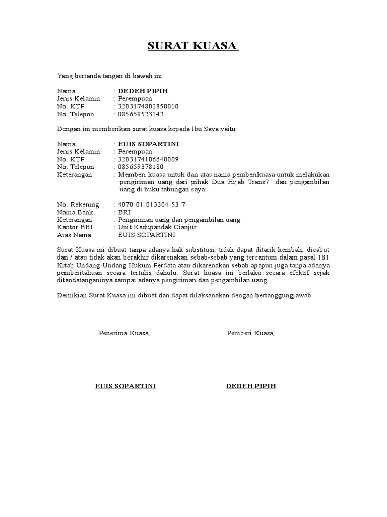 Contoh surat kuasa pengambilan uang di bank bri doc. Ada beberapa hal yang menyebabkan kenapa surat kuasa ini penting dibuat dan apa alasan penjelasanya. Contoh surat kuasa bank. Menulis surat kuasa bank seperti surat kuasa pengambilan uang di bank bukanlah hal yang susah. Namun sebisa mungkin anda hanya memberikan wewenang kepada orang yang betul betul bisa anda percayai sebab semuanya menjadi tanggung jawab anda sebagai pemberi kuasa bank. Contoh surat kuasa pengambilan uang di bank. Itulah contoh surat kuasa bank bri doc kami berharap contoh surat yang kami sampaikan dapat membawa manfaat untuk anda dan bila dirasa anda masih kurang puas dengan contoh surat dari kami maka kami memohon maaf sebesar besarnya karena kami menyadari bahwa blog ini masih jauh dari kata sempurna untuk itu kami mohon masukan dan saran dari anda demi kemajuan blog ini.