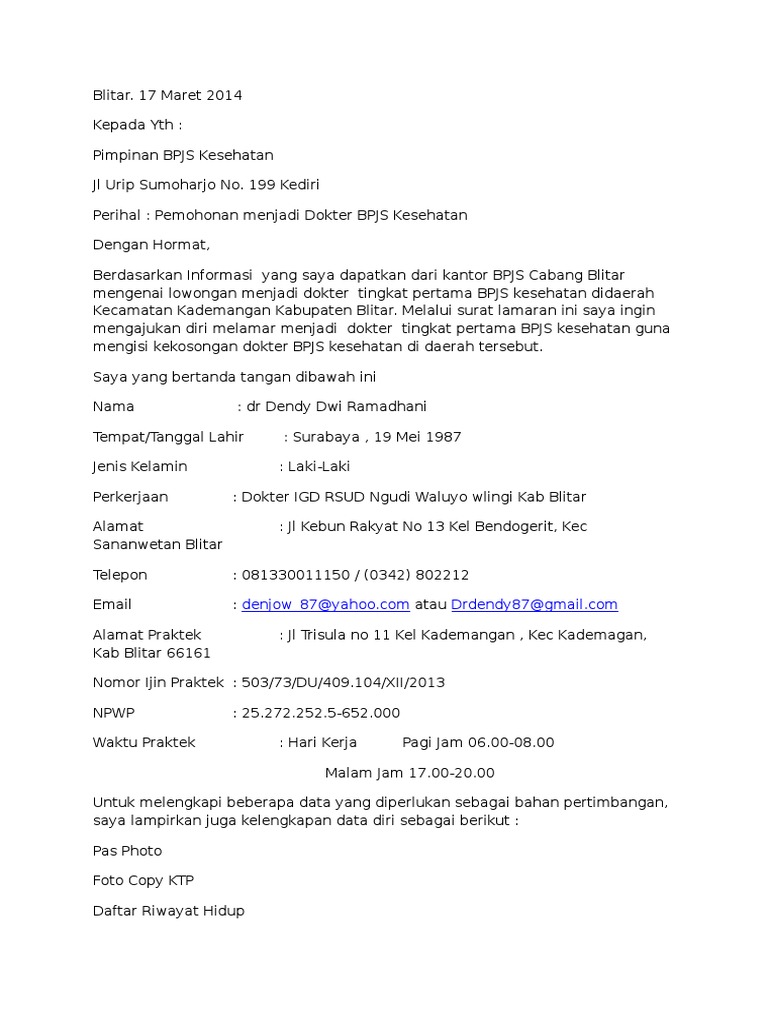 Contoh surat lamaran bpjs ptt. Itulah contoh surat lamaran kerja bpjs kesehatan ptt yang dapat admin kumpulkan. Admin blog contoh seputar surat 2019 juga mengumpulkan gambar gambar lainnya terkait contoh surat lamaran kerja bpjs kesehatan ptt dibawah ini. Mungkin terdapat jutaan artikel di internet yang menyediakan panduan bagaimana cara membuat surat lamaran pekerjaan yang disertai contoh surat lamaran pekerjaan baik itu surat lamaran kerja untuk melamar ke perusahaan maupun surat lamaran pekerjaan. Di internet ada banyak sekali paduan contoh surat lamaran kerja yang baik dan benar serta sesuai dengan kriteria kriteria yang seharusnya. Kepala bpjs kesehatan kantor cabang mojokerto jlempunala no46 kota mojokerto di tempat. Download contoh format surat lamaran pernyataan seleksi cpns kemenag.