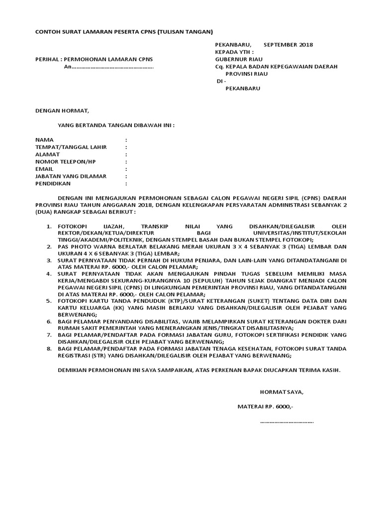 Contoh surat lamaran cpns 2018 tulis tangan. Sertakan resume yang baik pada saat mengirimkan surat lamaran. Apakah sama dengan contoh surat lamaran kerja yang lainnya seperti ketika kamu melamar disebuah perusahaan perbankan perusahaan bumn atau perusahaan swasta. Hal tersebut selaras dengan yang diungkapkan oleh kepala bkd jatim anom surahno. Surat lamaran lebih ke arah penegasan soal identitas dan jabatan atau formasi yang akan dipilih pelamar di pendafataran cpns 2019. Contoh surat lamaran kerja 2019 terbaru bagi seseorang yang ingin bekerja pada suatu perusahaan pasti akan mendaftarkan diri dengan membuat persyaratan tertentu agar kemungkinan besar diterima pada perusahaan tersebut yang salah satunya adalah surat lamaran kerja. Tetapi banyak sekali diantara kita yang tidak tahu bagaimana cara membuat surat lamaran kerja yang baik agar kemungkinan.
