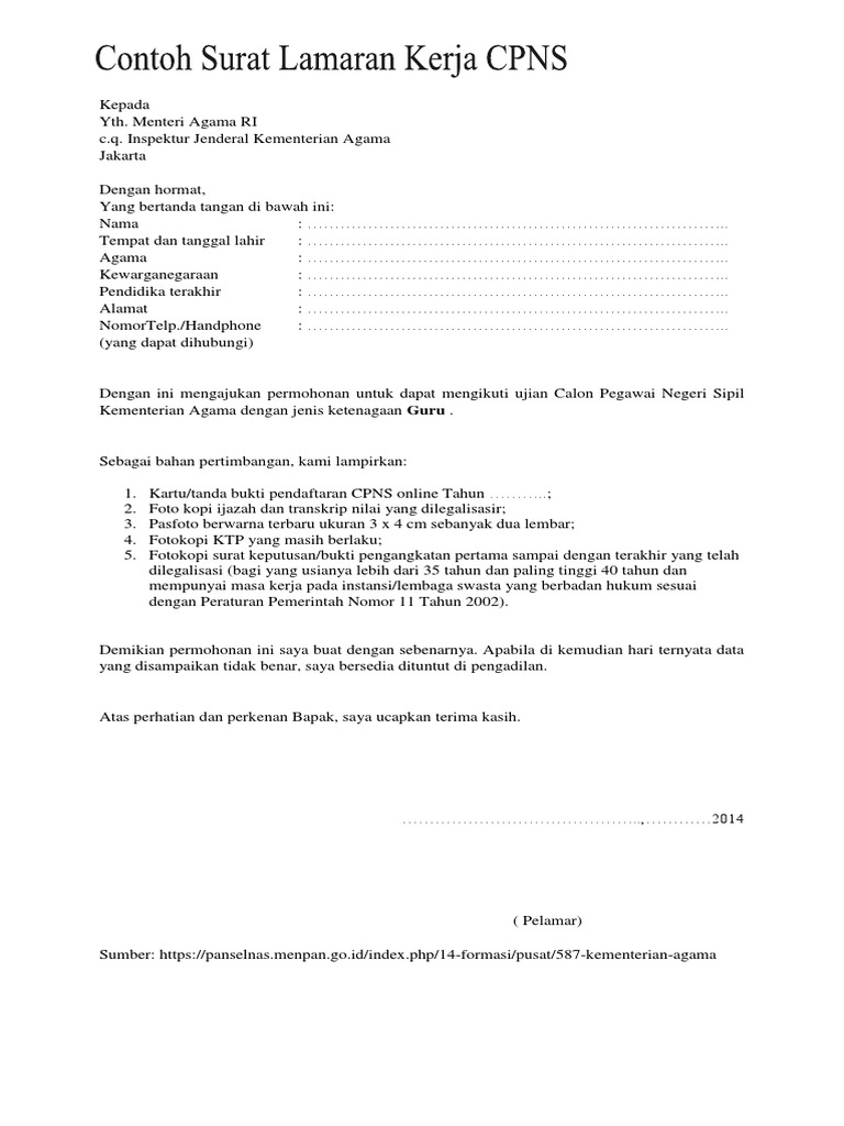 Contoh Surat Lamaran Cpns Kemenag Tahun 2018 Guru Maju