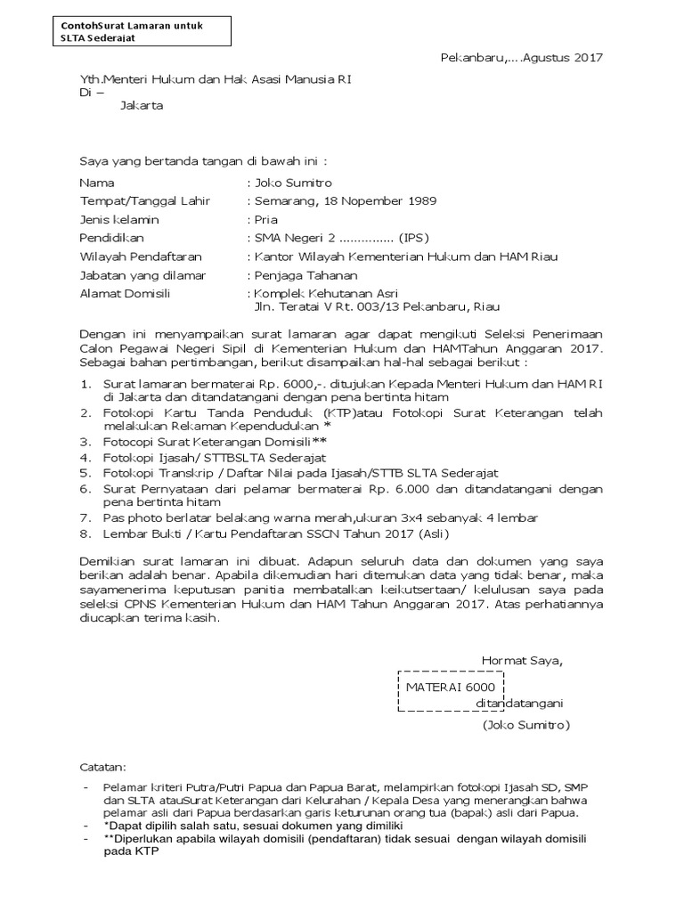 Pendaftar cpns harus tahu syarat unik dan nyeleneh dari berbagai lembaga ini net16 duration. Jadwal lokasi dan persyaratan pemberkasan ulang cpns kemenkumham tahun 2017. Nah bagi anda yang sedang membutuhkan referensi tentang bagaiman cara membuat surat lamaran cpns berikut ini kami sediakan contoh surat lamaran cpns untuk lulusan sma di salah satu kementerian yang kebetulan di tahun 2019 ini sedang membuka pendaftaran cpns. Official net news 70366 views. Bagi pelamar cpns 2017 di kemenkumham dan sebagai salah satu dokumen persyaratan yang harus dilengkapi seperti dikutip dari rilis situs cpnskemenkumhamgoid berikut merupakan contoh format surat lamaran dan surat pernyataan cpns 2017 di kemenkumham dengan kualifikasi pendidikan s 1 d 3 dan slta sederajat. Contoh surat lamaran cpns kemenkumham 2019 pelamar lulusan slta.