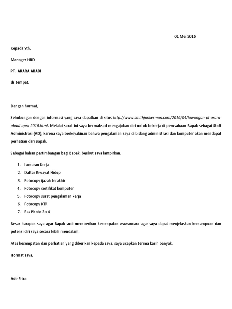 Contoh surat lamaran kerja administrasi secara umum pekerjaan administrasi merupakan salah satu pekerjaan yang membutuhkan tingkat kesabaran yang tinggi dan juga mampu berkomunikasi dengan baik kepada orang lain baik itu staf perusahaan atau tamu perusahaan nah atas dasar inilah maka wajar adanya jika pekerjaan seorang administrasi umumnya didominasi oleh para wanita mengingat pekerjaan. Baik mereka yang baru lulus kuliah s1 atapun mereka yang lulus sma atau smk tidak hanya mereka yang fresh graduate yang membutuhkan surat lamaran kerja mereka yang ingin pindah kerja juga membutuhkan surat lamaran kerja untuk tempat pekerjaan. Bagi anda yang sedang berencana untuk melamar pekerjaan satu hal penting yang harus anda buat dengan baik dan benar. Di artikel ini akan diulas secara singkat mengenai beberapa contoh surat lamaran kerja administrasi yang baik dan benar. Mungkin terdapat jutaan artikel di internet yang menyediakan panduan bagaimana cara membuat surat lamaran pekerjaan yang disertai contoh surat lamaran pekerjaan baik itu surat lamaran kerja untuk melamar ke perusahaan maupun surat lamaran pekerjaan. Administrasi adalah kegiatan catat mencatat surat menyurat merupakan kegiatan teknis ketatausahaan maka di setiap perusahaan sangat dibutuhkan tenaga alih dalam masalah administrasi perkantoran berikut adalah contoh surat lamaran kerja administrasi perkantoran yang benar.