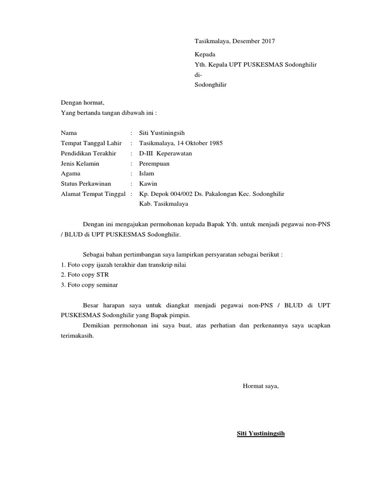Contoh surat lamaran kerja honorer puskesmas di atas sebaiknya dipergunakan secara bijak untuk melamar pekerjaan sebagai tenaga puskesmas non pns. Admin blog dapatkan contoh 2019 juga mengumpulkan gambar gambar lainnya terkait contoh surat pengunduran diri kerja di puskesmas dibawah ini. Surat lamaran kerja dibutuhkan guna melamar pekerjaan baru untuk kamu yang baru lulus kuliah pindah kerja cari suasana baru maupun fresh graduate. Contoh surat lamaran kerja di rumah sakit tentunya sangat diperlukan bagi mereka yang berencana melamar pekerjaan di rumah sakit. Dan pergunakanlah portal ini sebaik mungkin untuk sara media berbagi untuk kita semua. Surat lamaran kerja perawat bogor 12 oktober 2016.