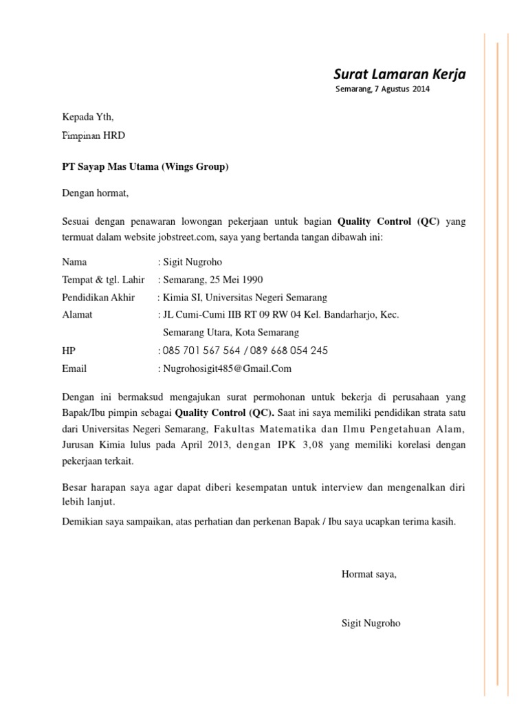 Contoh surat lamaran pekerjaan di pt. Banyak dari kita yang sering mengabaikan format surat lamaran. Contoh surat lamaran kerja pada artikel ini kita akan membahas contoh surat lamaran pekerjaan yang dapat kamu dapatkan beserta file doc nya. Surat lamaran kerja adalah surat yang digunakan untuk melakukan permohonan mendapatkan pekerjaan sesuai pengalaman pada perusahaan tertentu. Format dari contoh surat lamaran kerja sangat mempengaruhi diterima tidaknya kita ketika sedang melamar di perusahaan. Maka tidak heran ketika banyak orang membidik perusahaan dengan status pt perseroan terbatas. Surat lamaran kerja dibutuhkan guna melamar pekerjaan baru untuk kamu yang baru lulus kuliah pindah kerja cari suasana baru maupun fresh graduate.