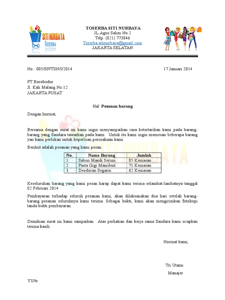 Contoh surat pemesanan barang surat pemesanan barang merupakan salah satu bentuk surat resmi yang diterbitkan oleh pembeli yang berisi tentang permintaan pembelian suatu barang tertentu yang ditujukan kepada pihak lainnya yang menjual barang baik itu perorangan maupun mewakili perusahaan.