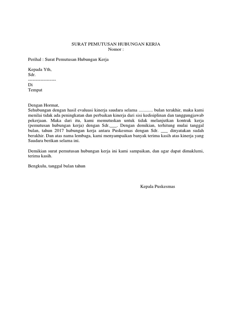 Contoh surat pemutusan kontrak kerja. Tentu saja karyawan yang sudah bekerja dengan baik dan menunjukkan loyalitas pada perusahaan tentunya tidak mengharapkan mendapat surat pemutusan hubungan kerja. Oleh karena itu maka kami memutuskan untuk tidak melanjutkan kontrak kerja pemutusan hubungan kerja dengan sdr. Materi pada artikel kali ini adalah mengenai surat pemutusan hubungan kerja phk. Part time full time kontrak artikel ini berisi contoh surat perjanjian kerja yang diperuntukan bagi karyawan harian karyawan paruh waktu dan karyawan kontrak. Contoh surat phk selamat datang kembali di situs kami para pembaca sekalian. Surat perjanjian kontrak kerja semua perusahaan pada dasarnya sama karena di indonesia sendiri segala sesuatu yang berhubungan dengan tenaga kerja dan karyawan sudah diatur dalam undang undang agar dapat menjamin setiap orang dapat mendapatkan hak nya masing masing.