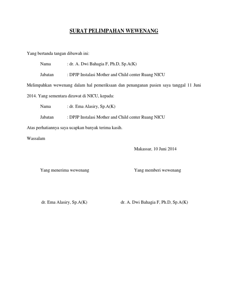 Yang bertanda tangan dibawah ini. Dpjp instalasi mother and child center ruang nicu atas. Yang sementara dirawat di nicu kepada. Contoh surat pelimpahan wewenang dokter.