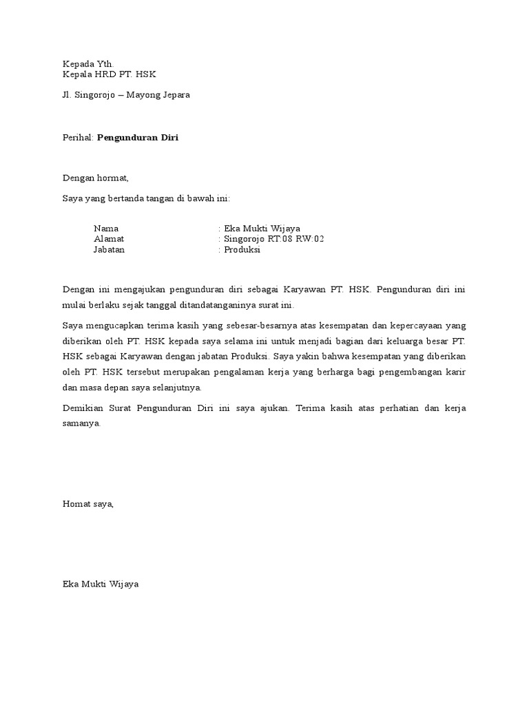 Contoh surat pengunduran diri 1. Contoh surat pengunduran diri ini dapat menjadi solusi bagi anda yang sudah tidak merasa nyaman di tempat kerja. Dalam artikel ini akan diberikan contoh surat pengunduran diri karyawan pabrik. Contoh surat pengunduran diri dalam dunia kerja atau organisasi tidak semua orang akan bertahan selamanya dalam perusahaan atau organisasi. Jangan sampai meninggalkan perusahaan begitu saja tanpa pemberitahuan beberapa waktu sebelumnya. Mengenal macam macam contoh surat pengunduran diri.