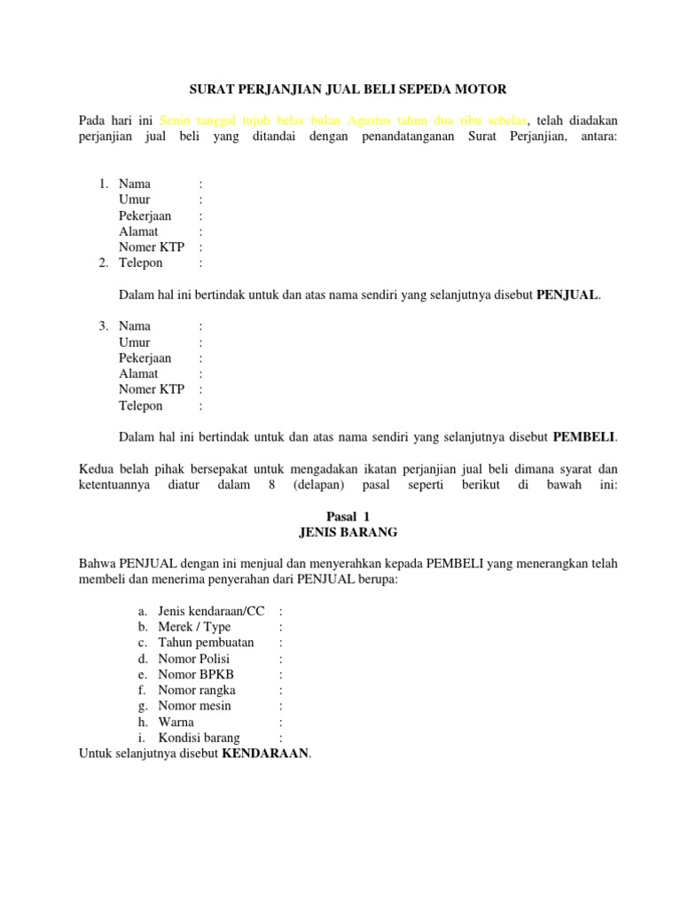 Contoh surat perjanjian jual beli motor. Contoh surat jual beli tanah. Surat perjanjian jual beli merupakan sebuah surat yang dibuat oleh seorang penjual dan pembeli untuk menjelaskan hak dan kewajiban yang tidak boleh dilanggar oleh kedua belah pihak dalam suatu urusan jual beli. Surat perjanjian jual beli bermaterai rp. Pengertian surat perjanjian jual beli motor. Itulah contoh surat perjanjian jual beli motor malaysia yang dapat admin kumpulkan. Nama penjual umur.